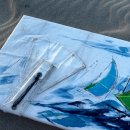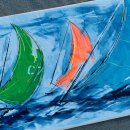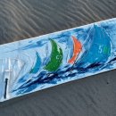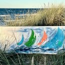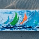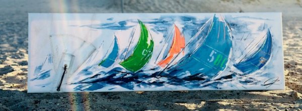 Alle Bilder meiner Reihe entstehen auf gebrauchten und ausrangierten Segeln von Sport- und teilweise Traditionssegelschiffen. Jedes Bild ist ein Unikat und ist gekennzeichnet durch die typischen Details eines alten Segeltuchs (Nähte, Segelnummern od. Flicken). Vereinzelt ergänze ich das Bild mit einer seitlichen Applikation, ein ausgewähltes Stück des Segels wird hierbei seitlich um den Rahmen befestigt und mit einem passenden Tampen bzw. Tauwerk ordnungsgemäß und ´seemännisch´ mit Hilfe eines Seemannsknotens am Rahmen befestigt. Kein Bild gleicht dem Anderen, da jedes Segel seine ganz eigene Geschichte in sich trägt und diese in das Motiv mit hineinwebt.