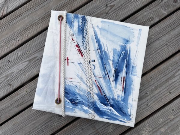 Alle Bilder meiner Reihe entstehen auf gebrauchten und ausrangierten Segeln von Sport- und teilweise Traditionssegelschiffen. Jedes Bild ist ein Unikat und ist gekennzeichnet durch die typischen Details eines alten Segeltuchs (Nähte, Segelnummern od. Flicken). Vereinzelt ergänze ich das Bild mit einer seitlichen Applikation, ein ausgewähltes Stück des Segels wird hierbei seitlich um den Rahmen befestigt und mit einem passenden Tampen bzw. Tauwerk ordnungsgemäß und ´seemännisch´ mit Hilfe eines Seemannsknotens am Rahmen befestigt. Kein Bild gleicht dem Anderen, da jedes Segel seine ganz eigene Geschichte in sich trägt und diese in das Motiv mit hineinwebt.